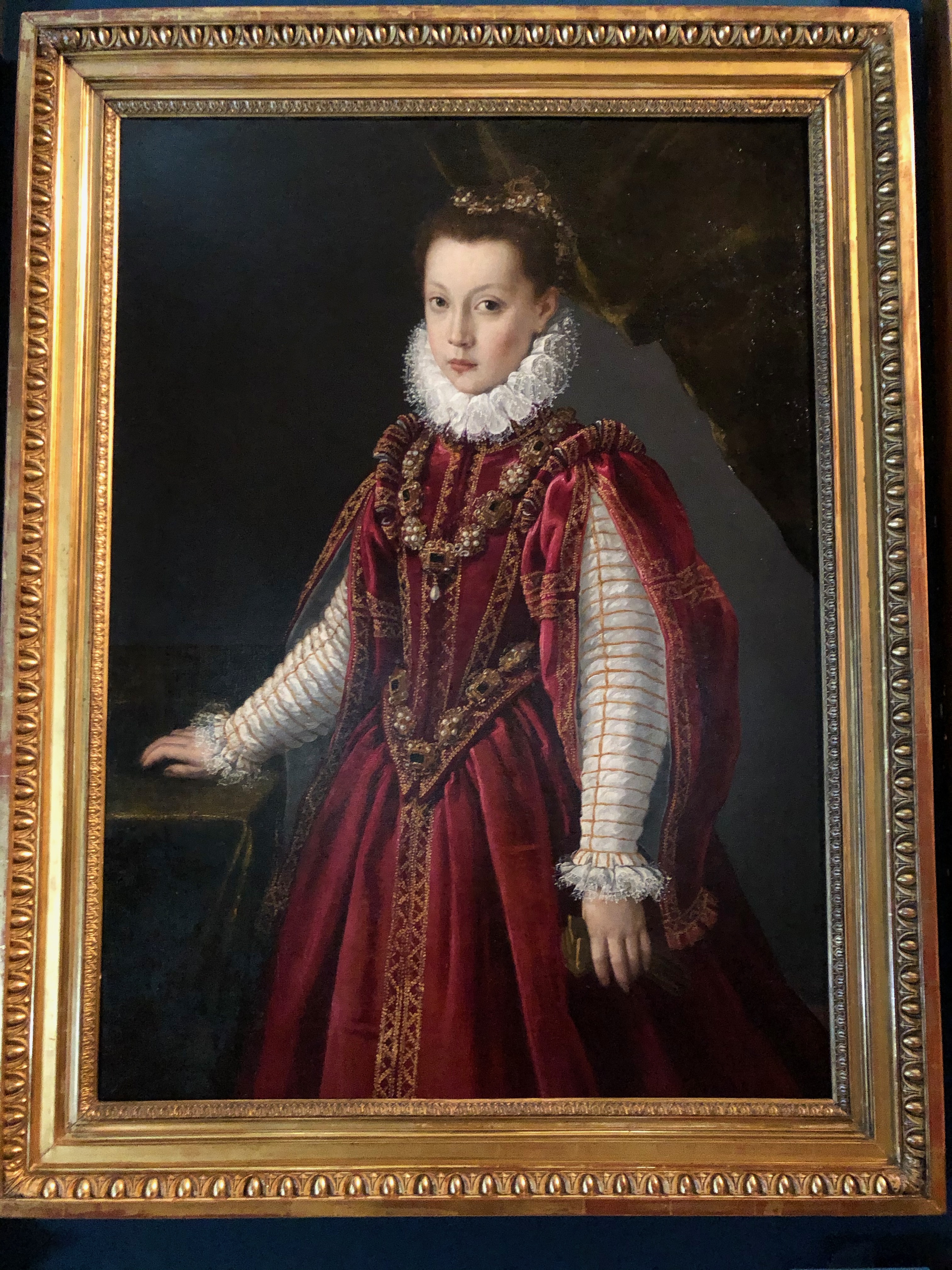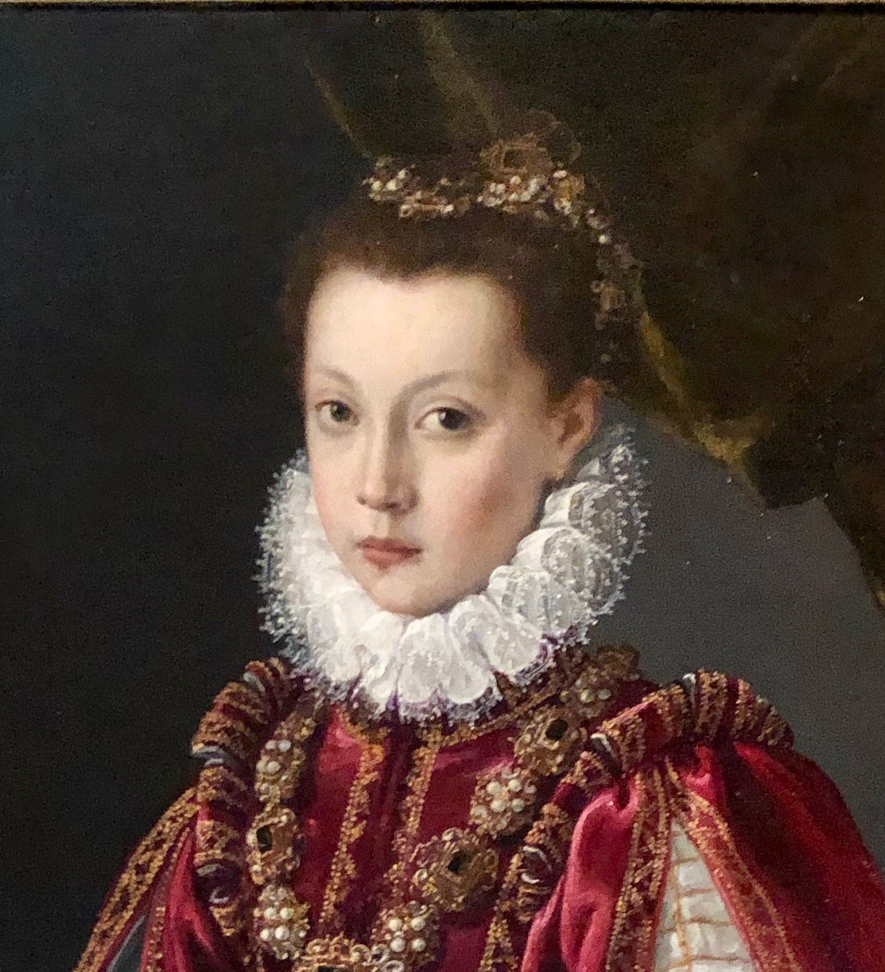 No-one seems to know who this person is, except that she was a noblewoman in the court of Phillip II of Spain, the location where the artist was working (more about that in a moment). The descriptions I found only spoke to her “serene expression,” her dress and ornate embroidery, the detail in the ruff, the jewels in her hair. She’s holding gloves, perhaps an indication of outside wear. But, IMHO, this girl is hurting, and I wanted to know more.