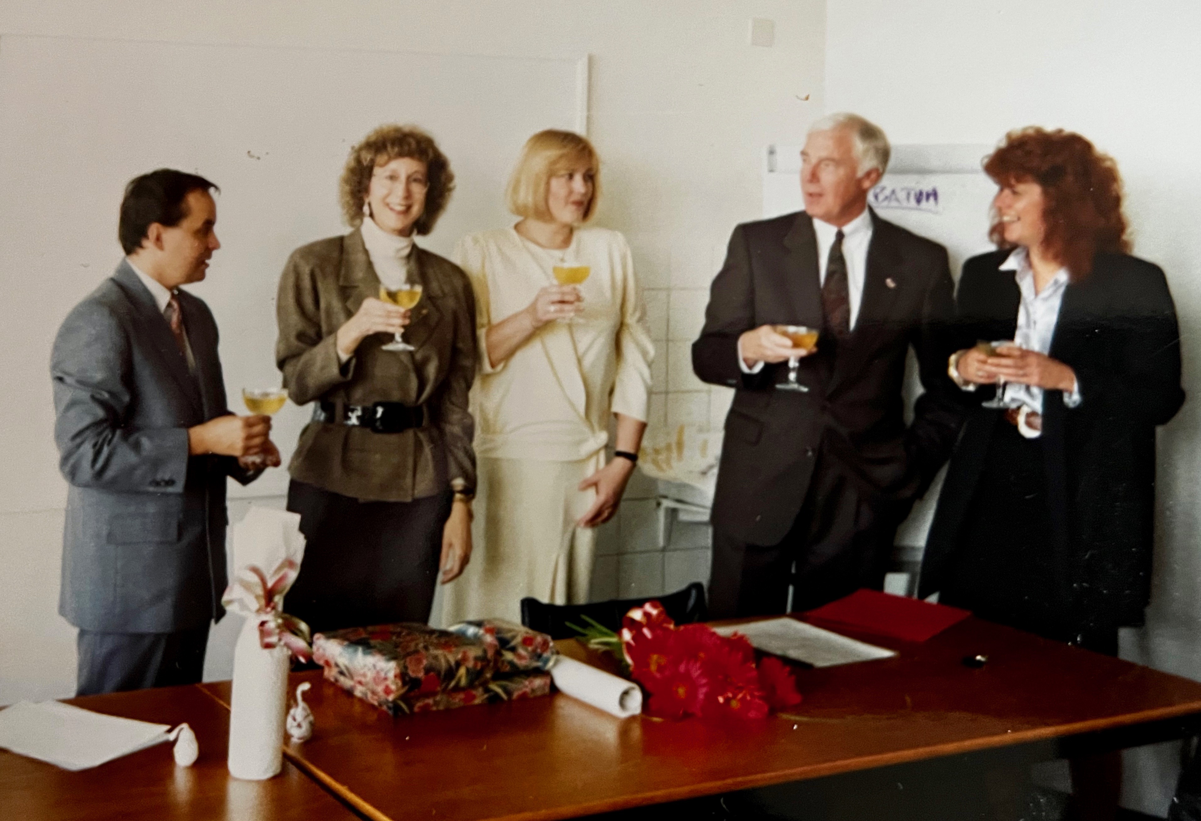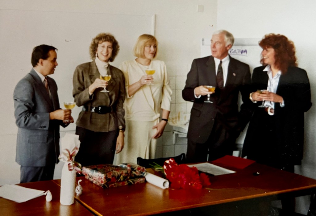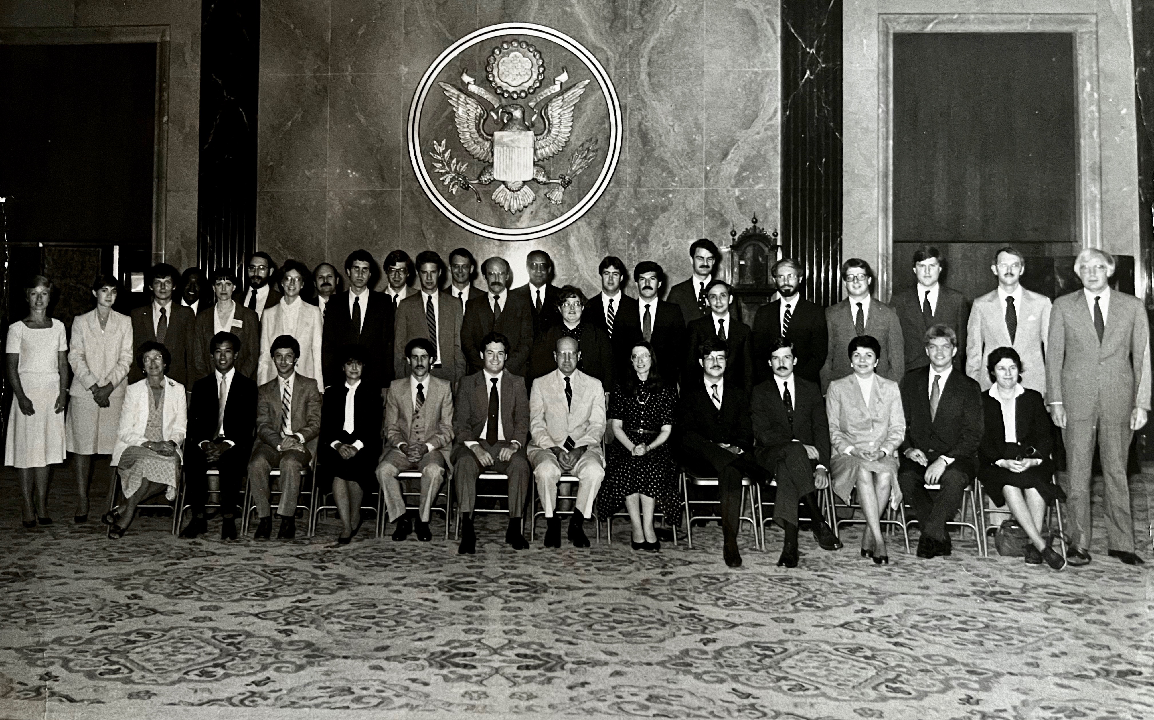 It all started here on a humid June day in the mid ’80s when I was sworn into the U.S Department of State Foreign Service. I’m on the left-hand side of the photo in a light linen suit with two mustachioed men behind me; Jim, the director of the A-100 orientation program, is on the far right.