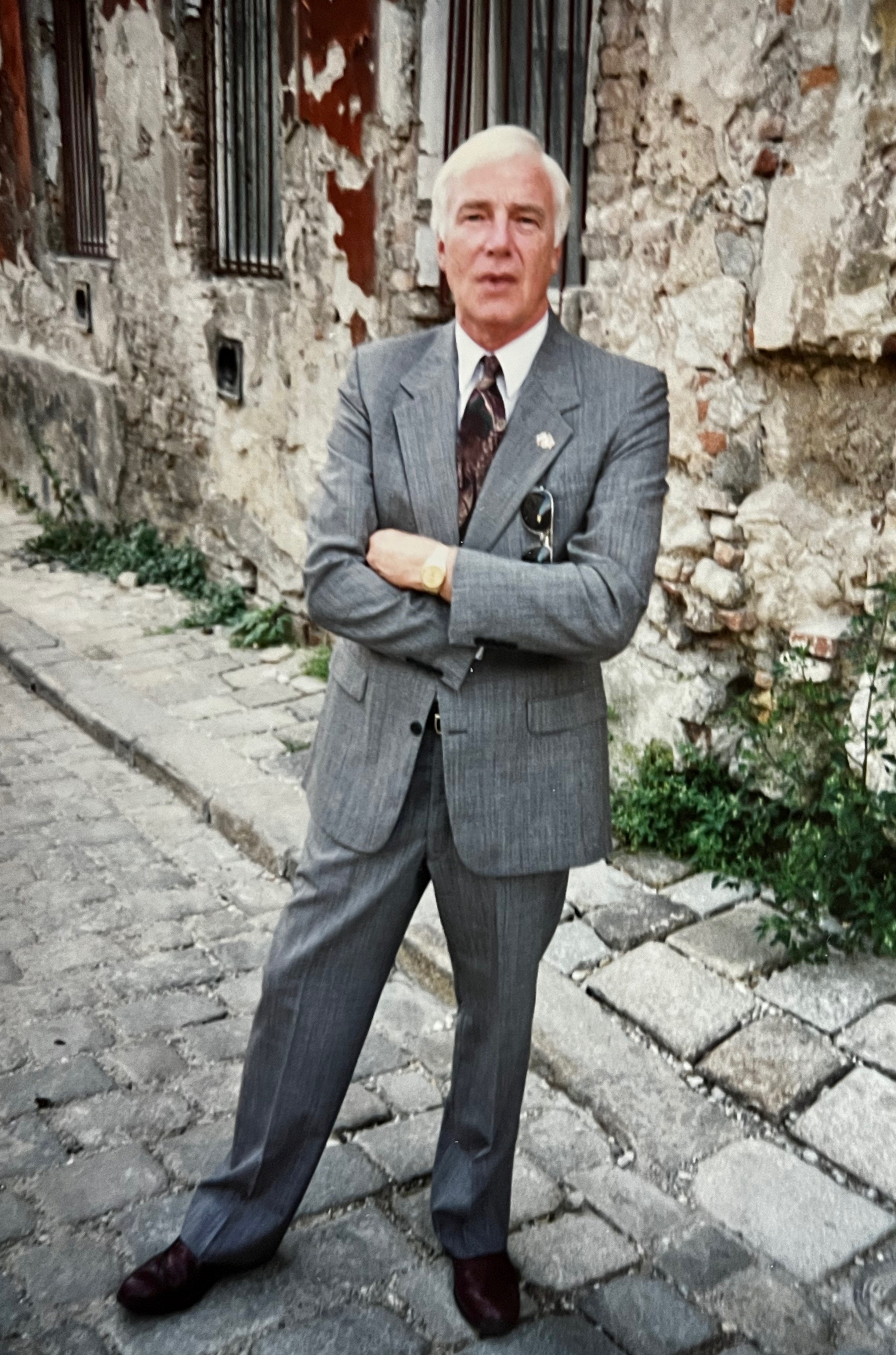 Jim wasn’t fond of being photographed (neither am I). but I did manage to wheedle him into posing for me during one of our strolls around Brat. While later in life he devolved to a wardrobe that consisted mainly of Fisherman Casual with Baseball Cap, this picture epitomizes for me the sharp, suave, charming, intelligent, diplomat from Central Casting which Jim always played to a tee. (On the other hand, Bratislava was just starting its urban renovation efforts; I’m sincerely hoping the building behind him…looks a bit better today than it did then.)