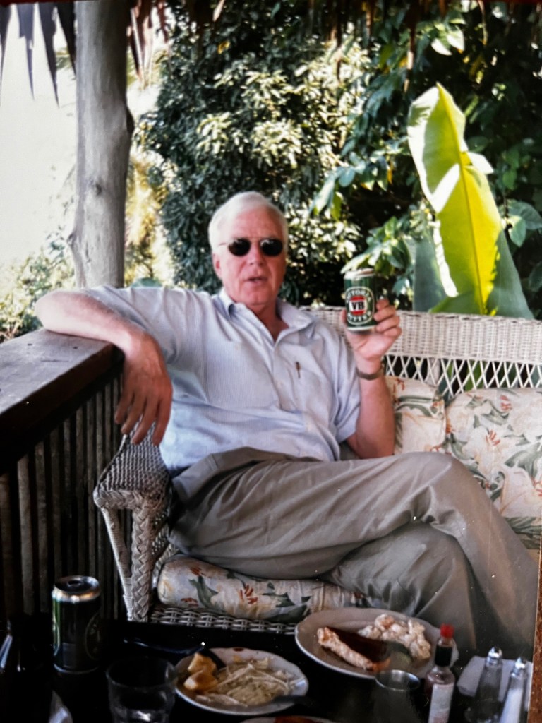 But if I were to tie Janet and Jim together, my personal roots and wings, it would be for the quality of the conversations we shared. Very different, of course, but both to a level that itched my mind and soul in the places that needed scratching. And with Jim, obvious enough from the pictures already shared, there was usually some adult libation involved. (The motto of the State Department is, after all, “I have only one liver to give for my country.”) So with a final salute, I give you a picture of Jim in paradise. We’re lunching in the restaurant patio of a great eco hotel called “The Village” in Pohnpei, FSM (since closed; a real shame) and we’re discussing Life and the Universe in grand style. Vale, Jim, safe travels, and save me a seat at the bar.