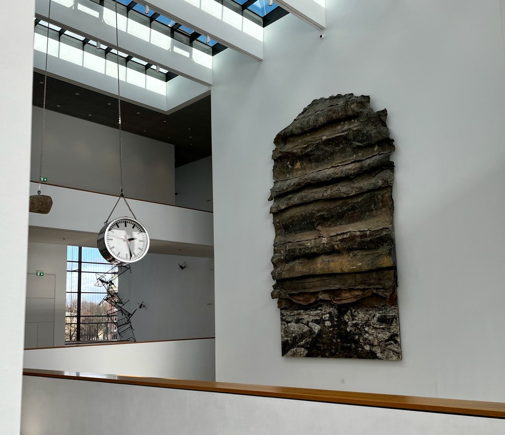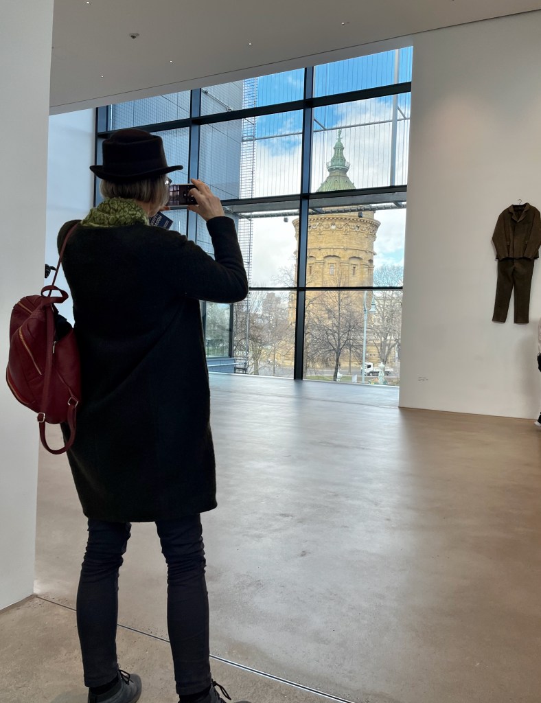 Fortified, we sheaded back near the Water Tower to Mannheim’s justly well-known Kunsthalle (art museum). This museum was reputed to have a large collection of the work of Anselm Kiefer, one of my favorites, but of course that wing was closed in preparation for a new exhibit. ^%$#. We really enjoyed the place anyway, and here’s A doing a little photo art of her own: