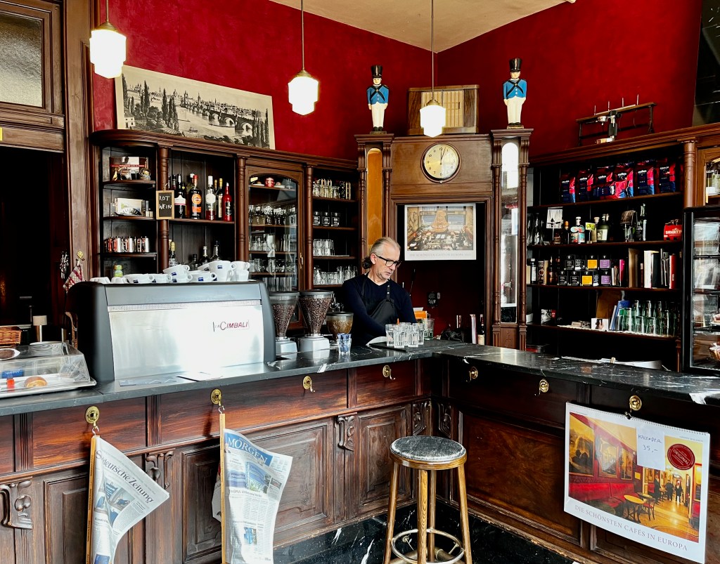 After that somber moment, we needed a break. Not far away, A spotted a charming little cafe and we settled in to do our best imitation of Sartreans enjoying an espresso and Gaulois (absent the Gaulois, of course) in Cafe Prag: