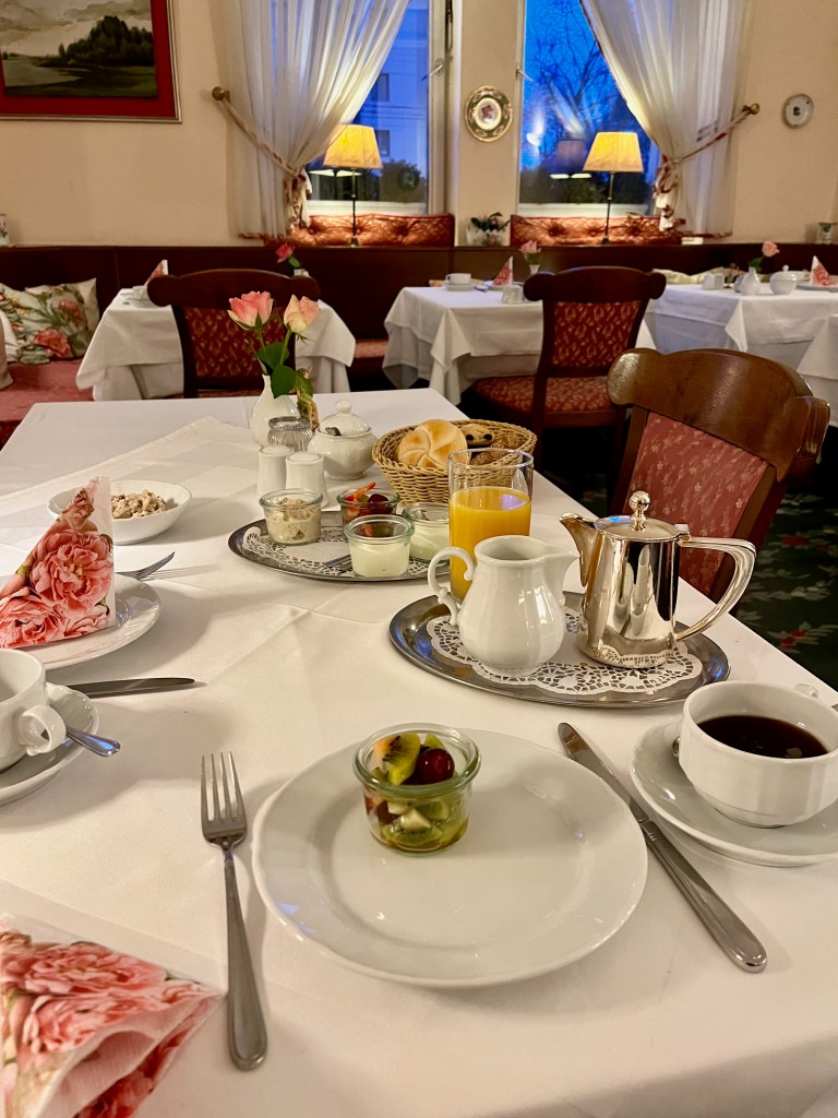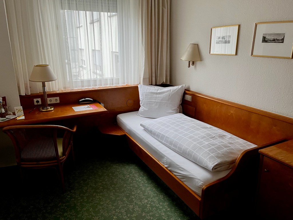 A and I booked ourselves into a cheery little B&B near the train station where we found charming folks and inexpensive digs that made us feel right at home. Here’s my cozy rack at the Hotel Kurpfalzstuben: