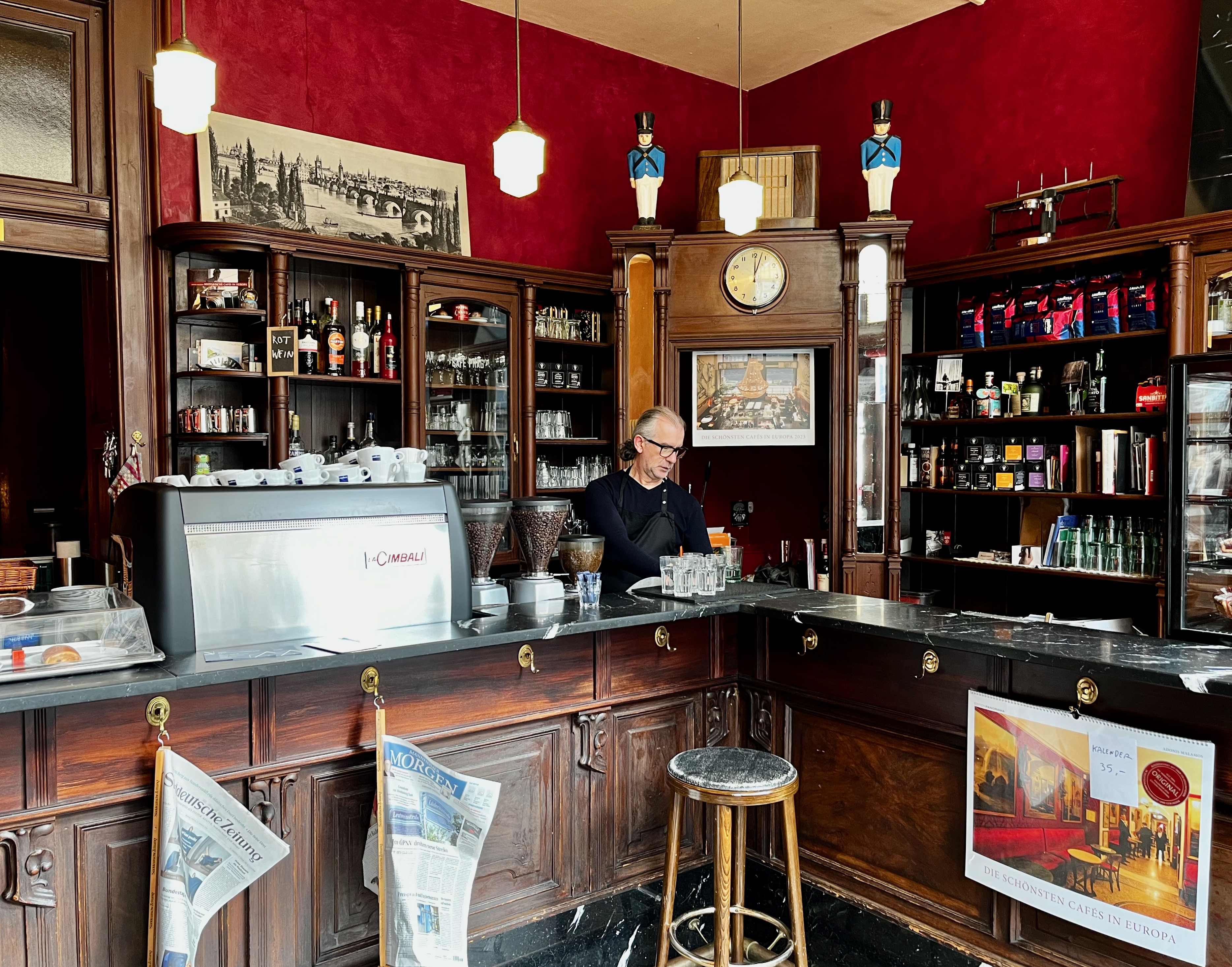 After that somber moment, we needed a break. Not far away, A spotted a charming little cafe and we settled in to do our best imitation of Sartreans enjoying an espresso and Gaulois (absent the Gaulois, of course) in Cafe Prag: