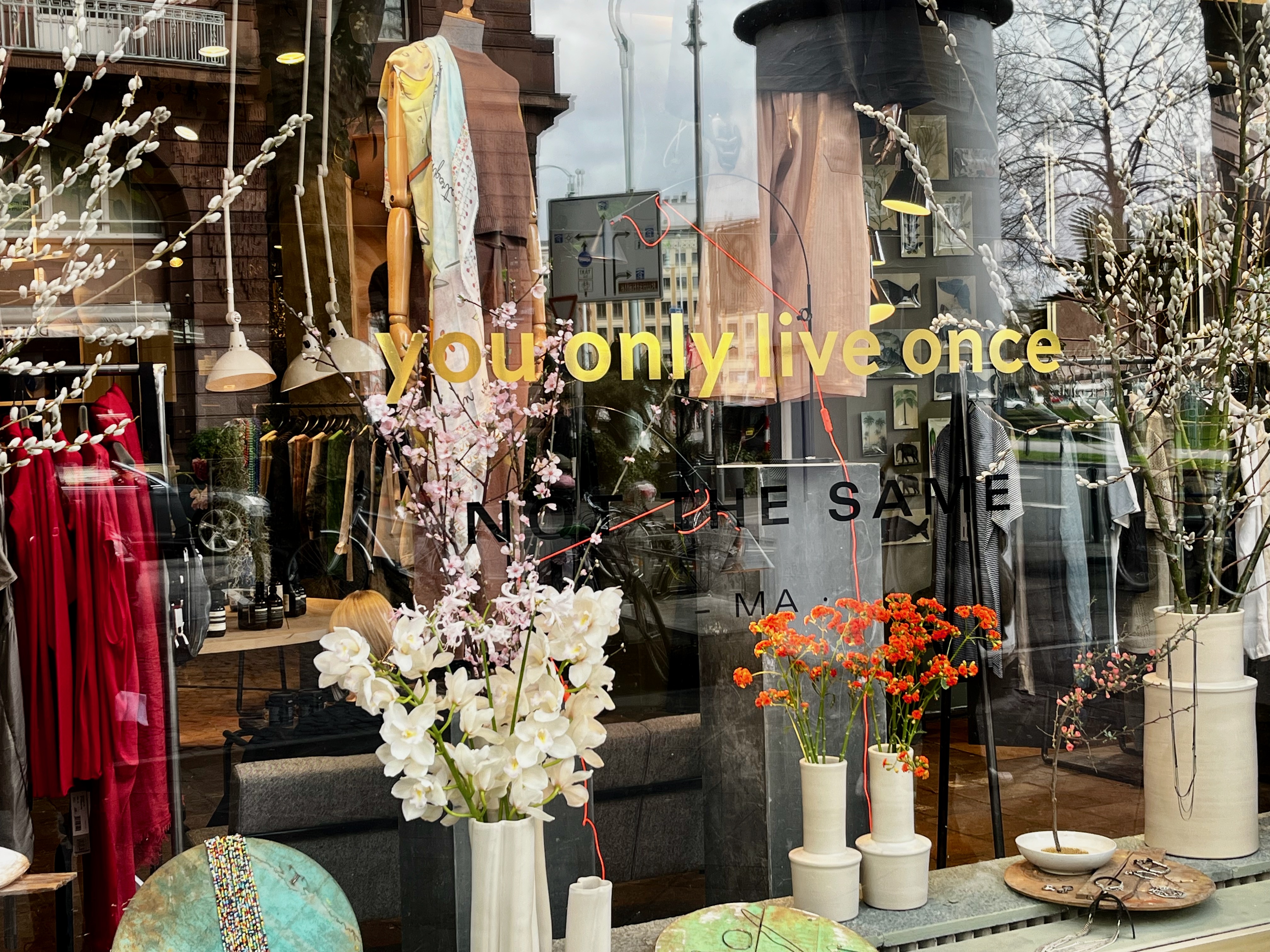 After the museum we walked around the area nearby and enjoyed seeing a few remainders of pre-WWII architecture, some which appears to form an arcade (see the green space at 3:00 o’clock on the Quadrate map above). There were more cafes and some high-end shops to enjoy and then melt at the sight of the prices. But one window stood out to me, and A and I decided it won the day: