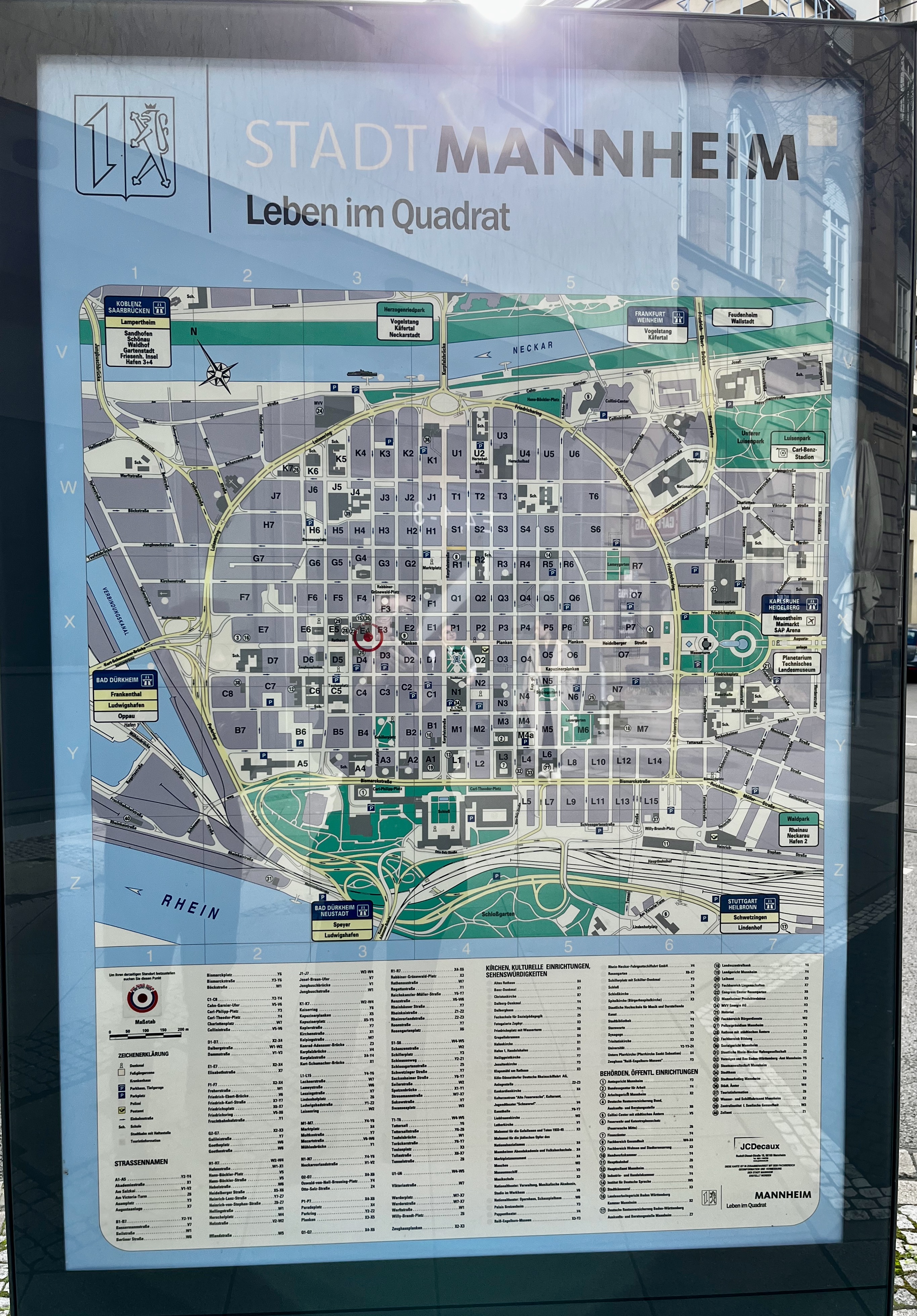 One of the most curious and interesting facts about Mannheim is the layout of the central city. A huge Baroque palace was built near the Rhine River by Electoral Prince Frederick IV of the Pfalz in the early part of the 17th century. His architect, the Dutch fortification expert Bartel Janson, then laid out a city that consisted of a large circle containing a carefully numbered grid pattern which remains to this day: