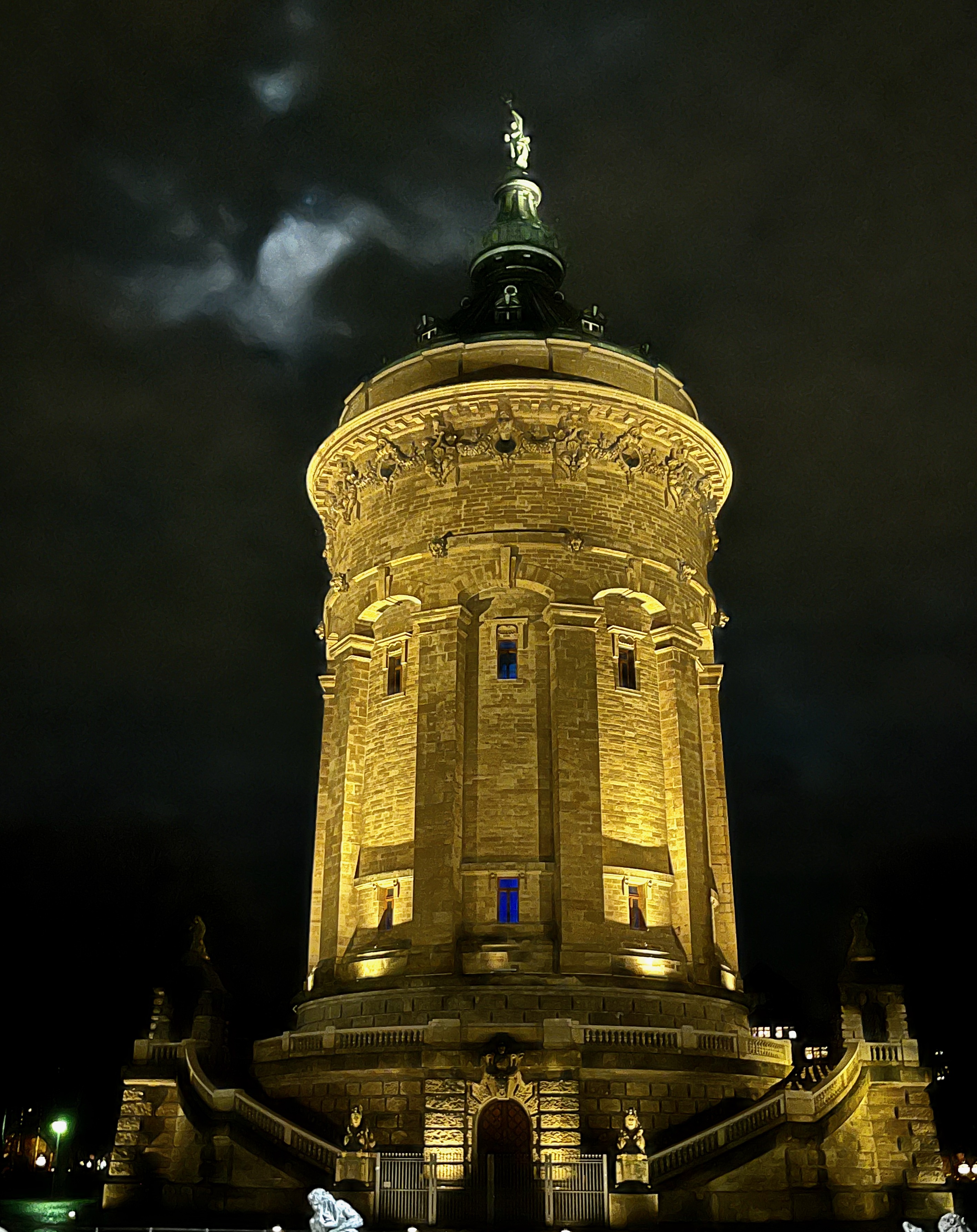 Stretching our legs after dinner in the balmy evening air, we first strolled the main commercial drag, the Planken, which is lined with lights and allows pedestrians to mingle with the occasional tram. At the end of the Planken, we enjoyed a lovely moonlit view of Mannheim’s iconic Water Tower: