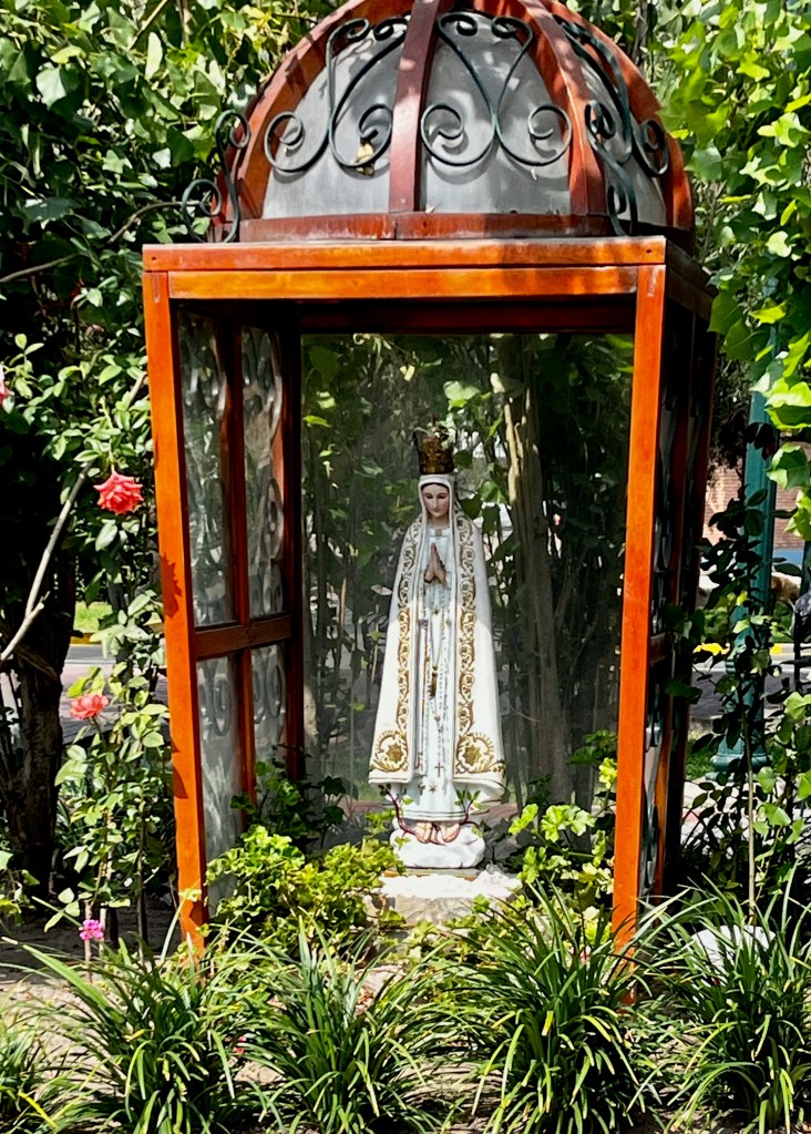 Heartily fortified for the day, I spent the morning preparing my PowerPoint for tomorrow and then I strapped on my trusty sandals and headed out. First stop – the lovely park with the olive trees for a blessing from the Virgin herself: